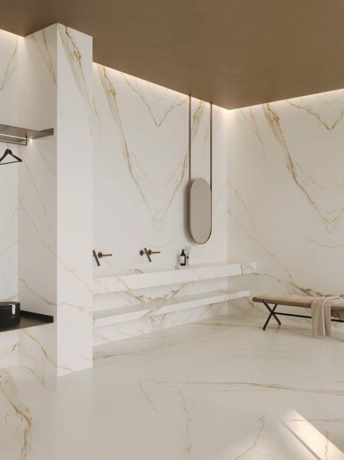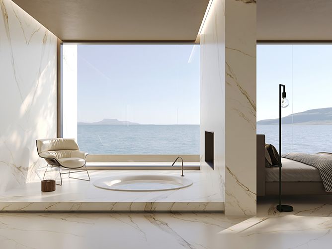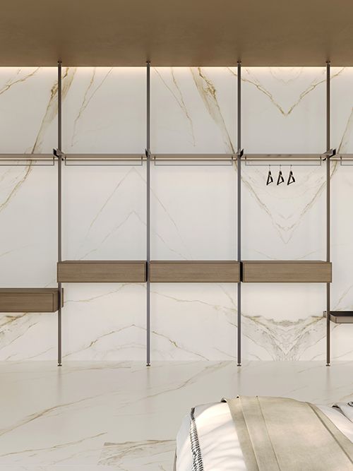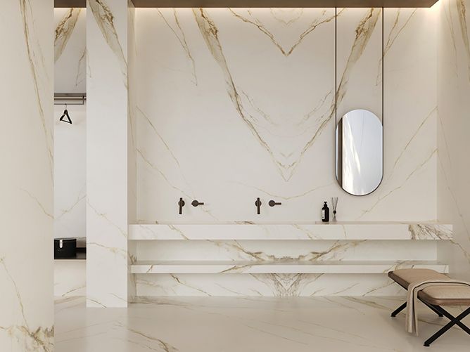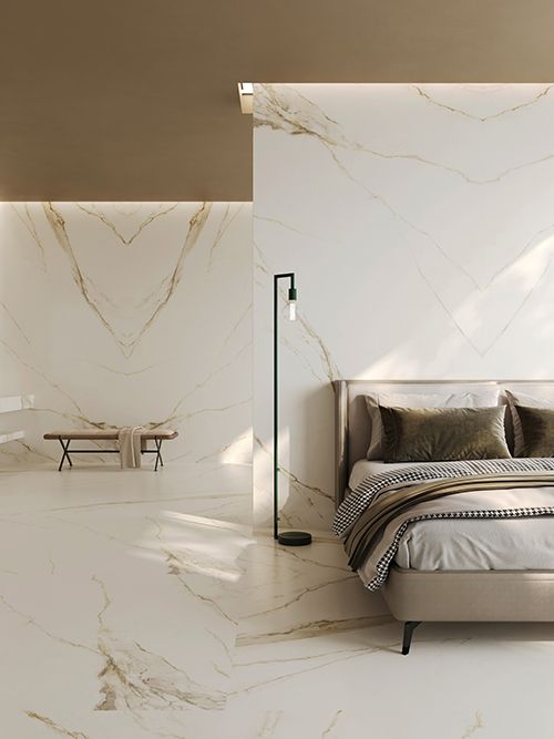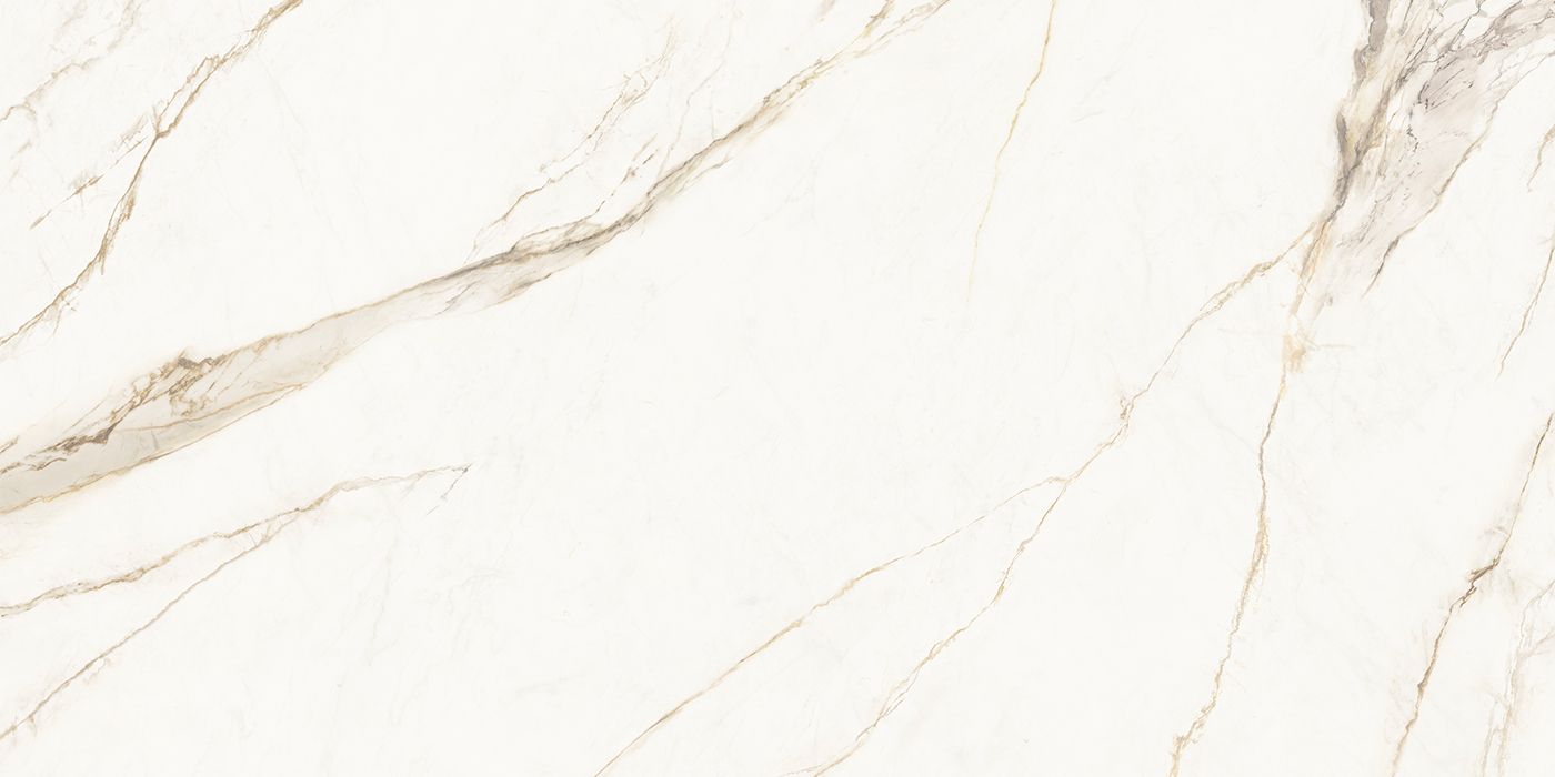 金色的高贵与典雅,从表层到里层,不同的金色色调自然地浸刻到版面当中,底色素雅端庄的淡金色,让素材保留了卡拉卡塔石材的纯粹,根状石纹自然延展而开,金色如同丹青素绘尽情刻画其中,同时与底色形成墨染般的自然过渡,晶体状的细节尽显自然华贵,勾勒出皇家御用的自然原石经典。